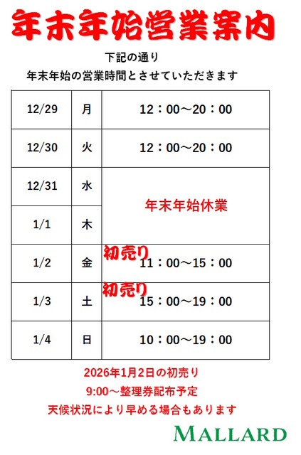 年末営業は30日(火)まで、
